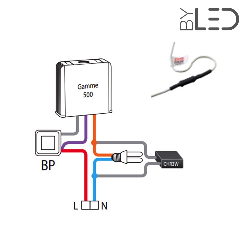 Lorsque la charge est constituée d'ampoules économiques standard ou LED et que la puissance installée est inférieure à 16W, il faut câbler, en parallèle à l'une des ampoules l'accessoire, cette charge résistive.