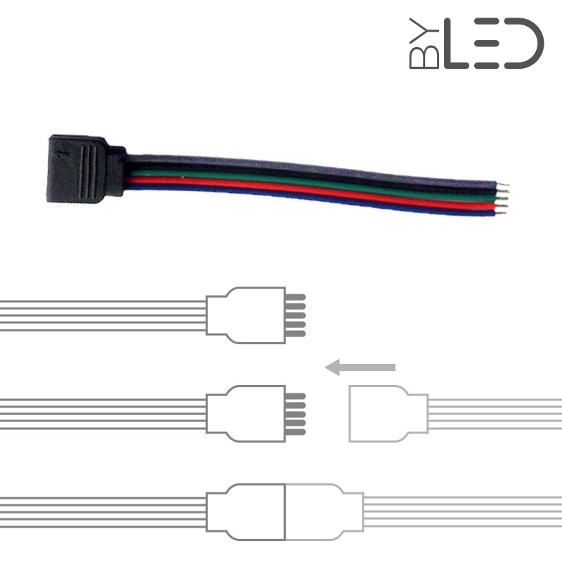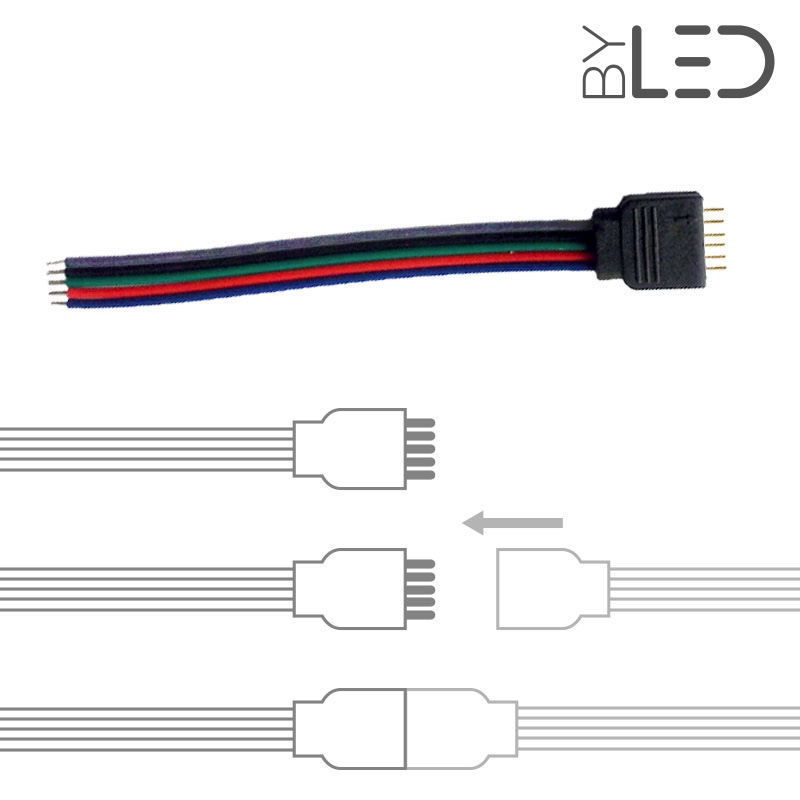 Ces câbles sont équipés à une extrémité d'un connecteur 4 broches Mâle, à l'autre extrémité les fils sont dénudés et pré-étamés pour être soudés sur un ruban ou branchés sur un bornier à vis.