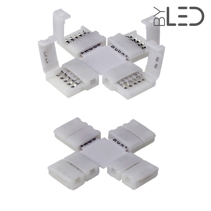 Ce connecteur permet de faire une jonction en forme de "Croix" entre 2, 3 ou 4 sections de rubans LED RGB+blanc (5 pins).