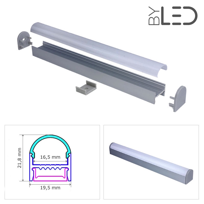 Profilé pour bandeau LED, en aluminium. Diffuseur givré arrondi.