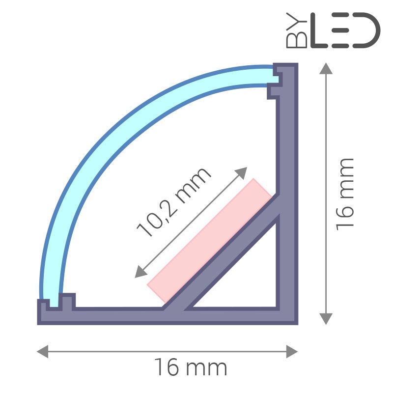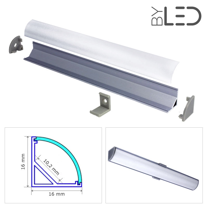 Profilé alu d'angle pour bande LED. Diffuseur arrondi, type ¼ de rond.