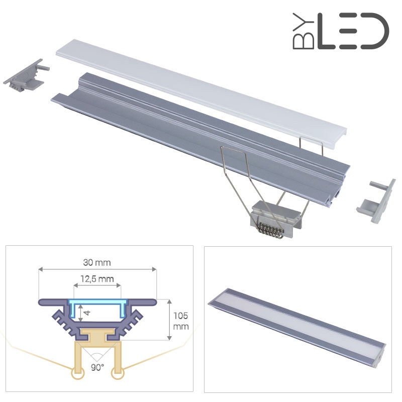 30mm x 10,5 mm – Peut intégrer un ruban LED de 12,5mm de large max.