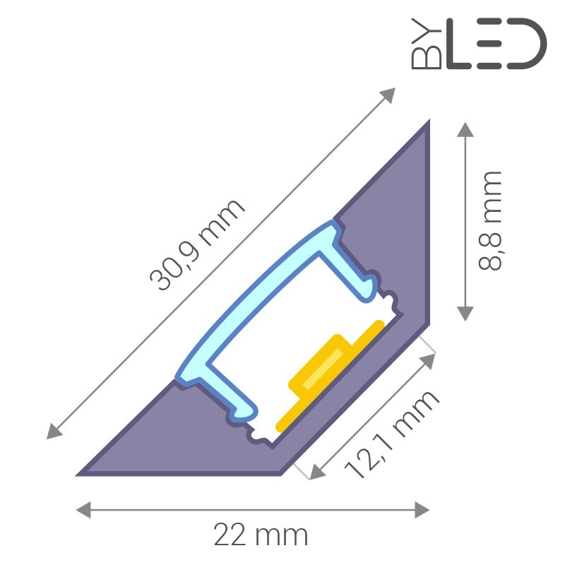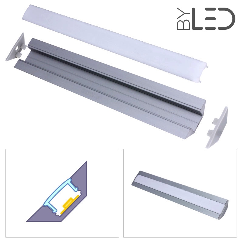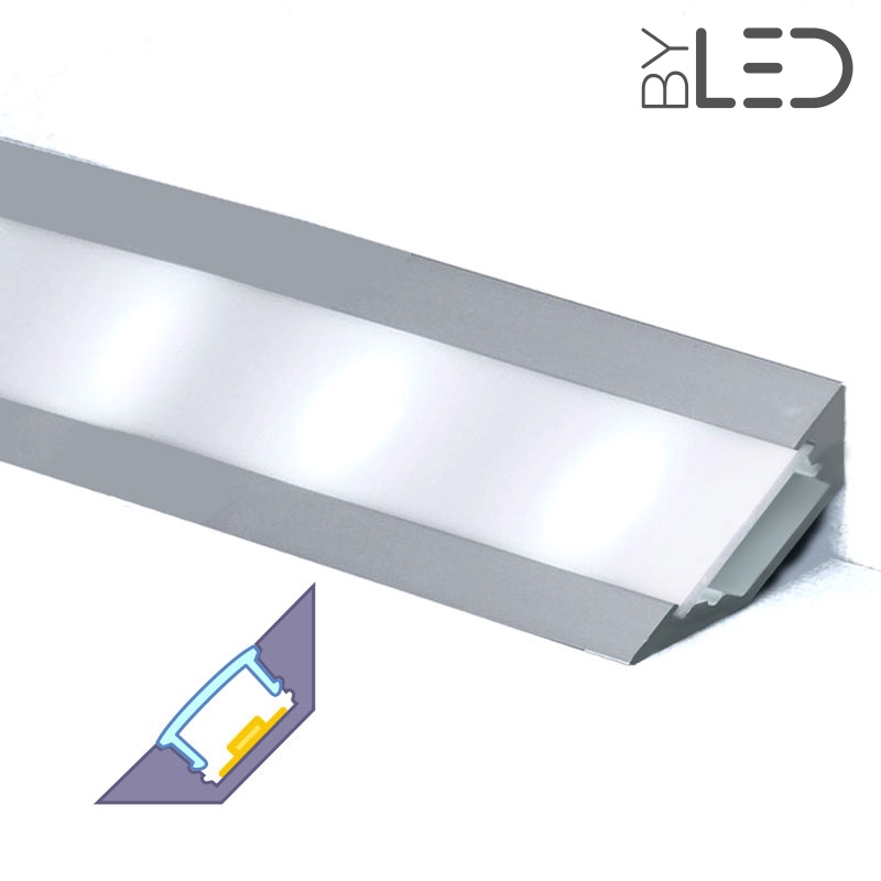 Ce profilé LED en alu est spécialement conçu pour être installé dans un angle et éclairer une vitrine, un plan de travail, des étagères, une armoire, etc.