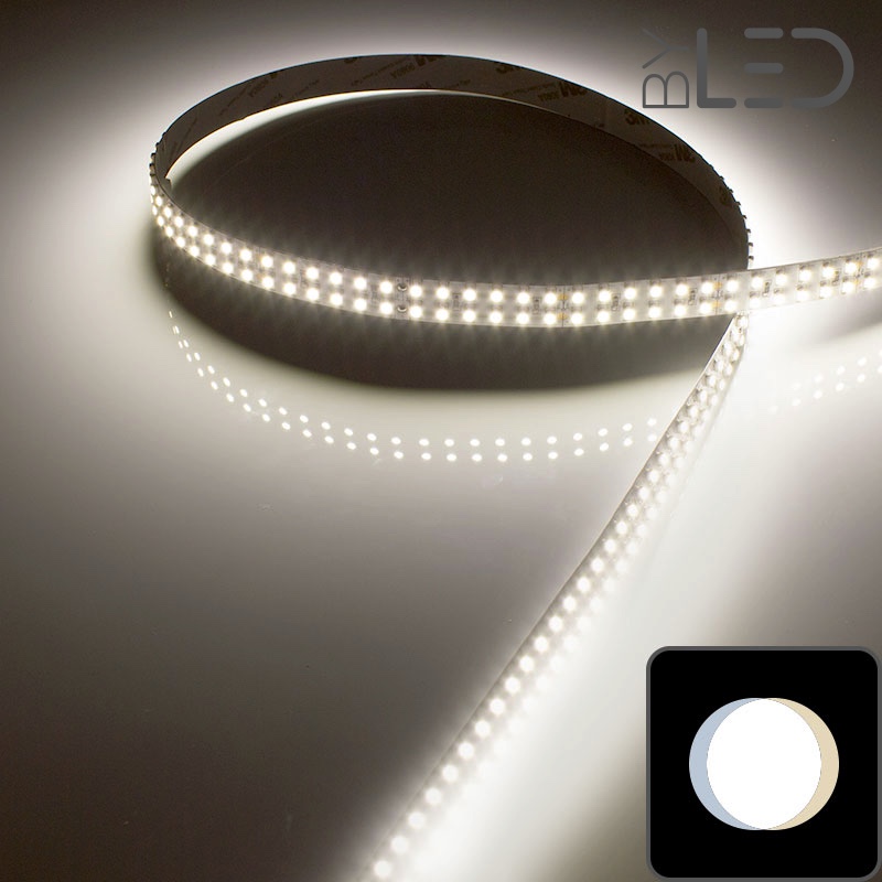 Ce ruban LED double se distingue par sa forte concentration en LED (240 LED / m) ce qui lui permet de délivrer une intense luminosité et un très faible « effet de point », idéal pour les grandes surfaces. Pour une finition soignée, vous pouvez fixer votre ruban dans un profilé en aluminium conçu pour les rubans larges.
