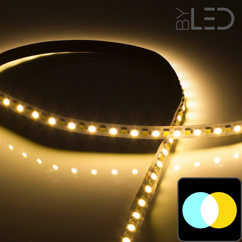 Ce ruban LED héberge un double circuit alternant des LED blanc chaud et des LED blanc froid, il permet ainsi d'obtenir la température de couleur désirée parmi une palette allant de 2600 K à 6000 K. Délivrant une lumière très puissante, ce modèle peut aisément être fixé dans des pièces de surfaces importantes. Usage intérieur (IP20).