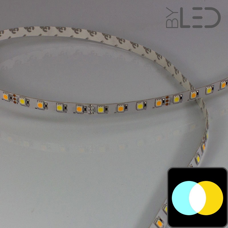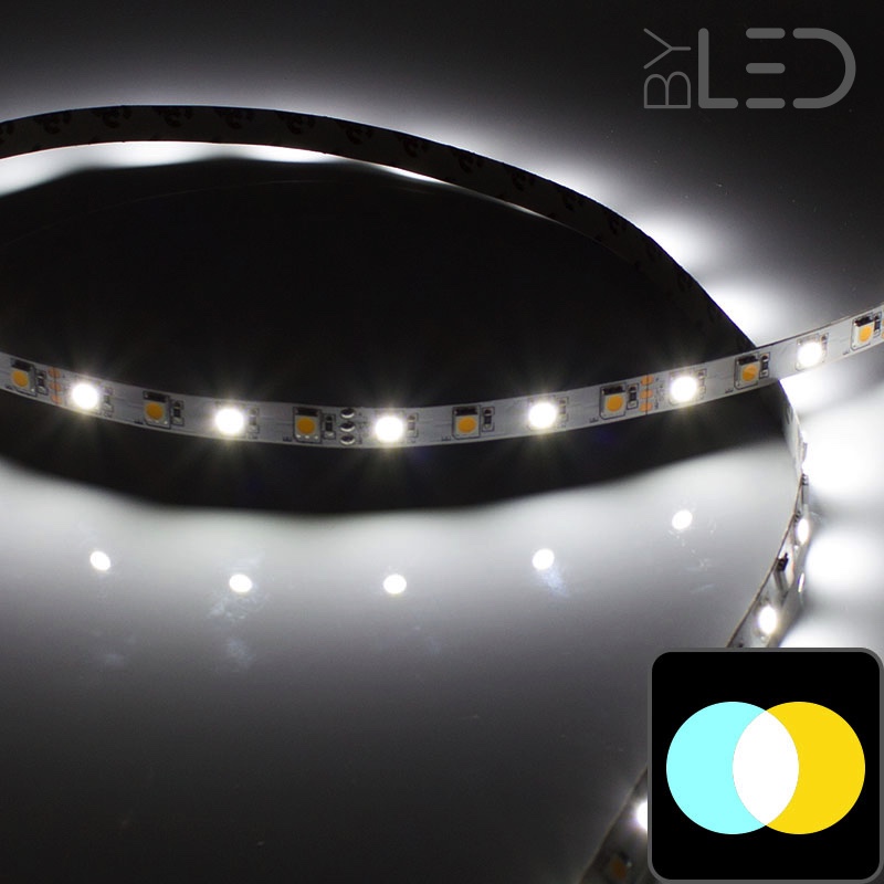 Ruban LED dimmable 5m. 2 circuits alternant LED blanc pur et chaud.