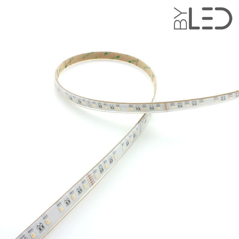 Ruban LED 24V RGB + Blanc chaud. Très forte luminosité. Utilisation extérieure IP68 – LED 5050 – 19,2 W/m pour 60 LED/m sous 24 volts.