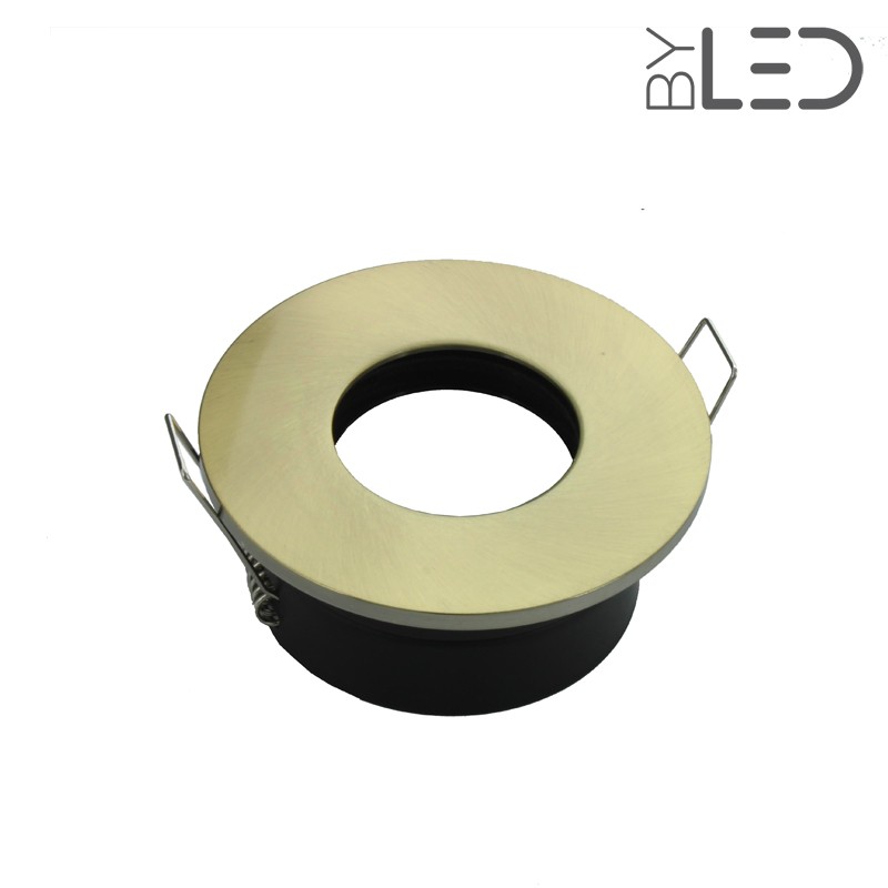 Spot encastrable fixe à collerette ronde, plate, Or satiné. Label BBC, conforme RT2012.