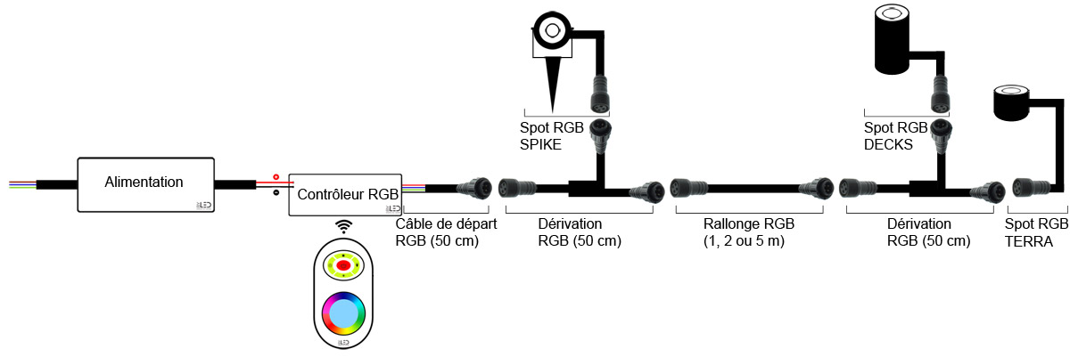 Selon vos besoins, vous pouvez rallonger le câble d’alimentation grâce à nos dérivations, câbles de départ et rallonges étanches pour spot RGB Spike.