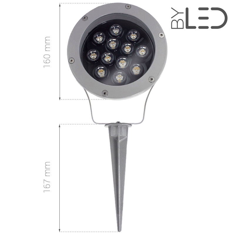 Spot LED de jardin sur piquet 12W. En aluminium laqué gris, vitre en verre et visserie en inox.