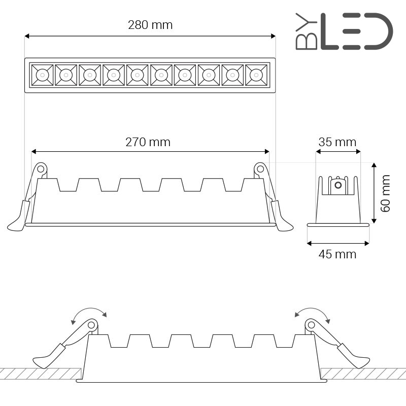 Dimensions : 280x45x60mm - Indice de protection IP44 - Diffusion 45° - Alimentation 230V