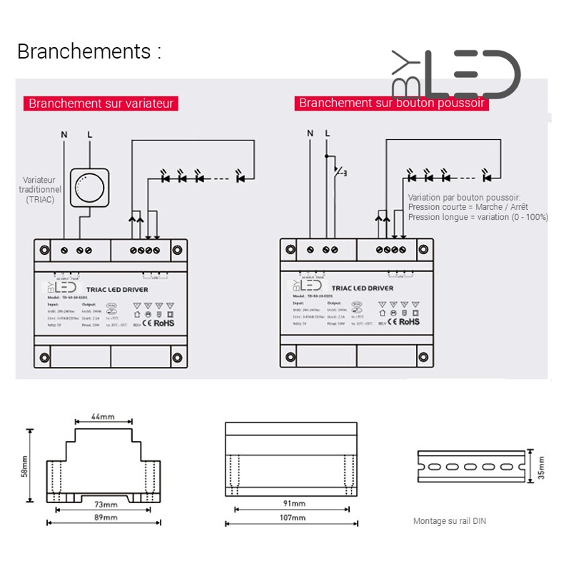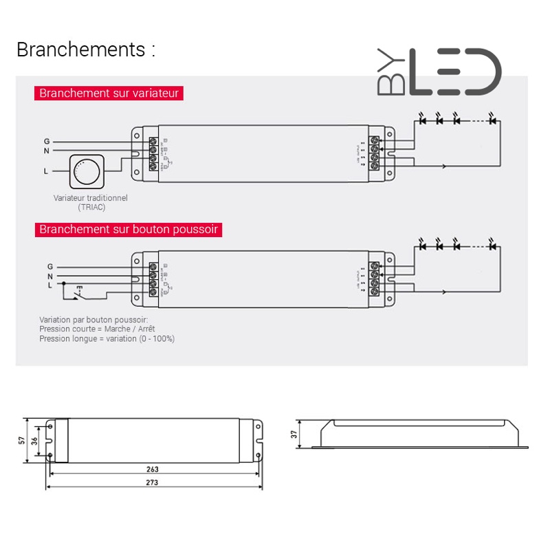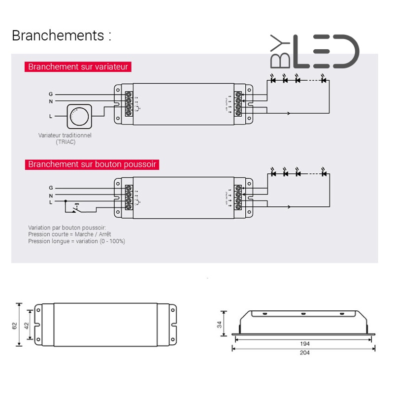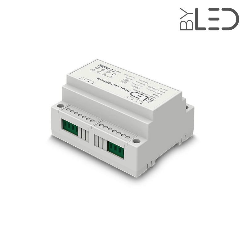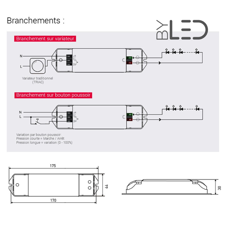 Ce convertisseur haut de gamme permet de piloter (0 - 100%) directement un ruban LED monochrome depuis un variateur mural 230 Volts traditionnel ou à partir d'un bouton poussoir: